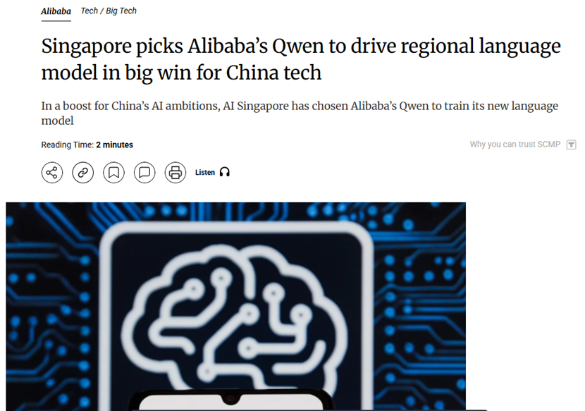 《南华早报》报道,新加坡国家人工智能计划正在进行一次重大战略调整,该计划的最新版本的东南亚语言大模型项目“Sea-Lion”中,已停止采用Meta模型体系,改为基于阿里云的通义千问Qwen架构构建,标志着中国开源AI模型在全球影响力版图中的一次关键扩张。