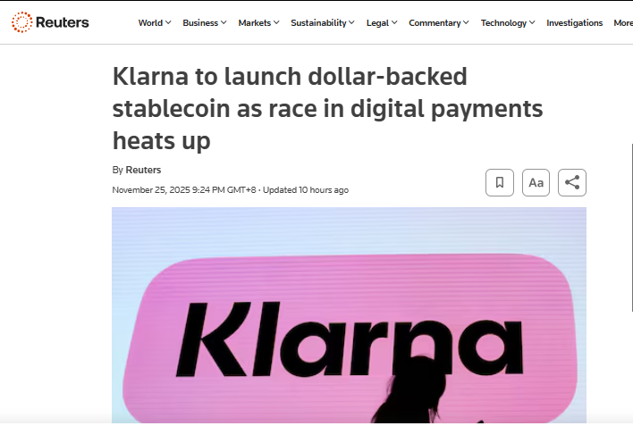 路透社报道称,Klarna是一家从事分期付款业务的公司,同时也是欧洲最大的金融科技公司之一,其最大的用户群在美国。作为加密货币领域的新进入者,Klarna的目标是提供一个快速、便宜的支付解决方案,挑战传统银行业务;与PayPal和Stripe近期的动作一致,此举正值全球监管机构强化数字资产规范之时,Klarna有望在美国GENIUS法案和欧洲MiCA框架下获益。